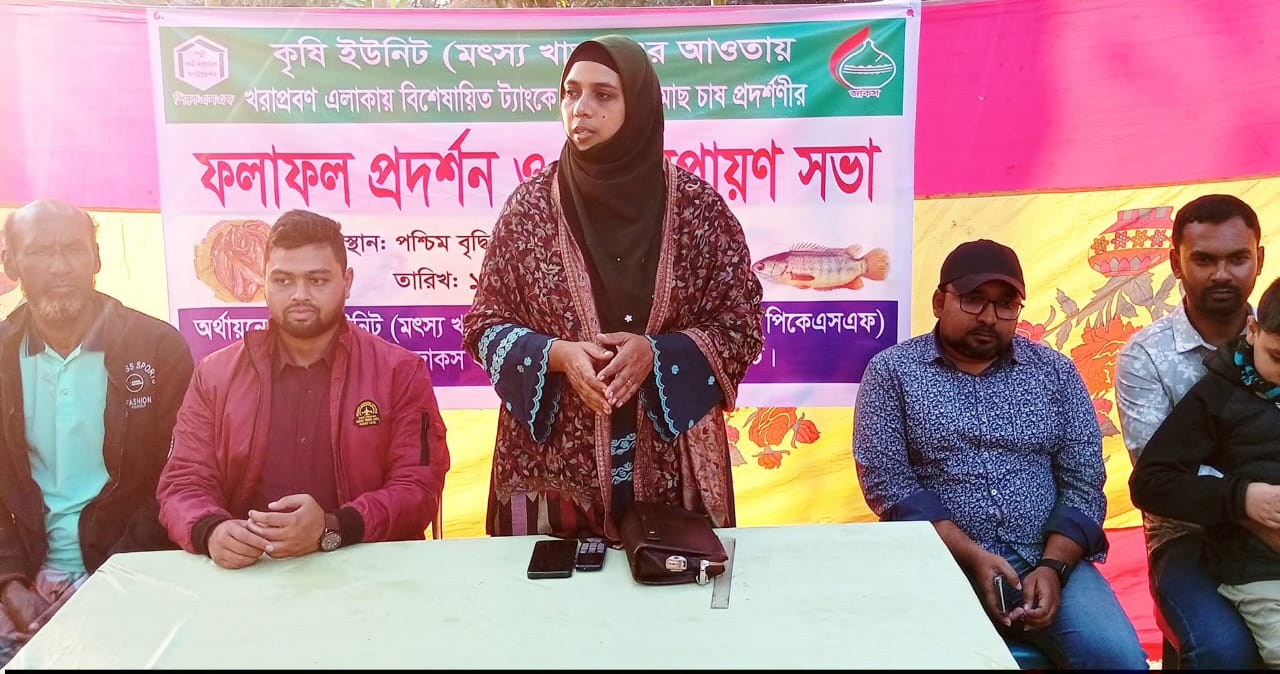 জাকস ফাউন্ডেশনের আয়োজনে পিকেএসএফের অর্থায়নে খরাপ্রবণ এলাকায় বিশেষায়িত ট্যাংকে উচ্চমৃল্যের মাছচাষ প্রদর্শনী অনুষ্ঠানে প্রধান অতিথির বক্তব্য রাখেন সিনিয়র উপজেলা মৎস্য কর্মকর্তা মোছাঃ মাহমুদা খাতুন পপি। এসময় উপস্থিত বক্তব্য দেন জাকস ফাউন্ডেশনের মৎস্য কর্মকর্তা মোঃ রাশিদুল ইসলাম চৌধুরী, প্রাণিসম্পদ কর্মকর্তা কৃষিবিদ আব্দুল্লাহ আল জাবির, সহকারী মৎস্য কর্মকর্তা মোঃ রাফসান জানী ও সহকারী প্রাণিসম্পদ কর্মকর্তা মোঃ আবু সুফিয়ান।